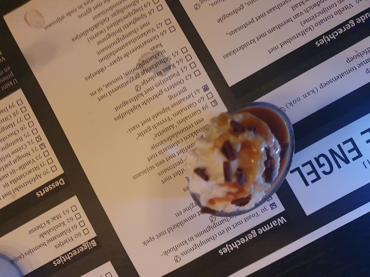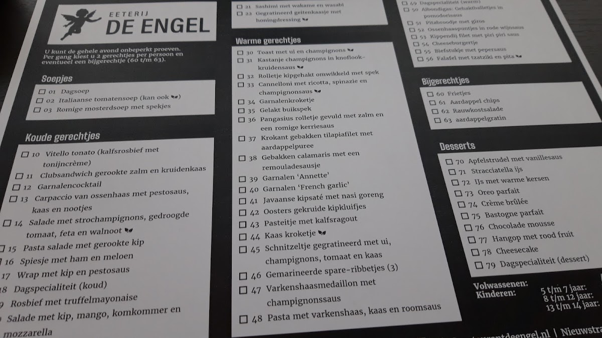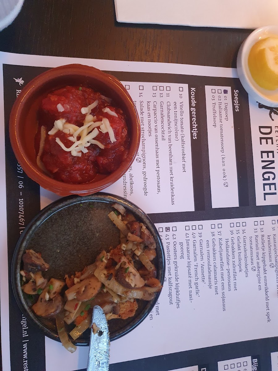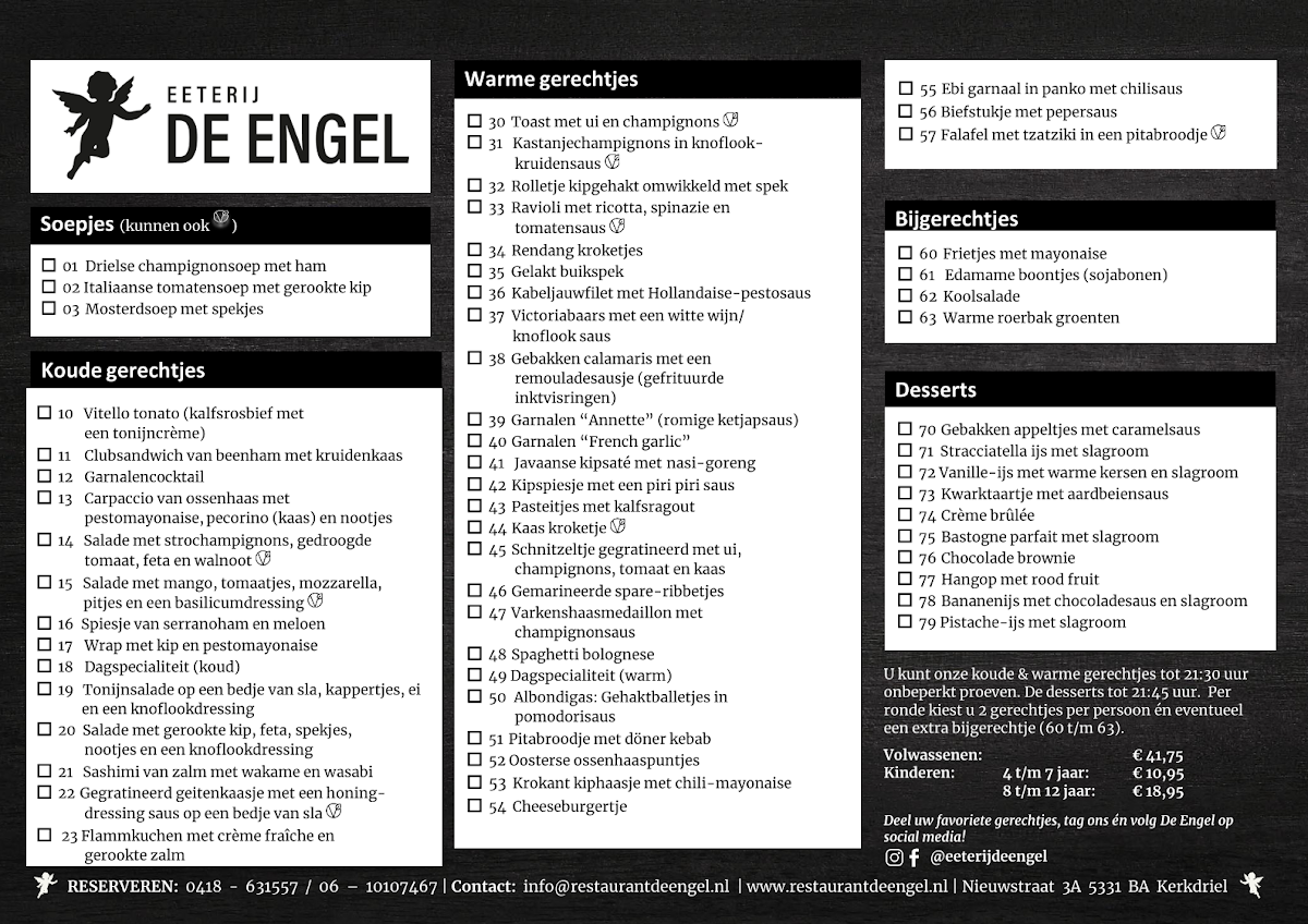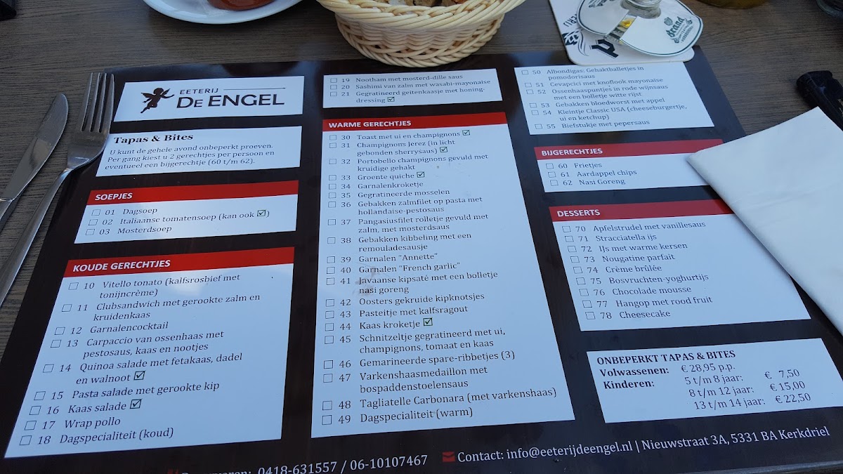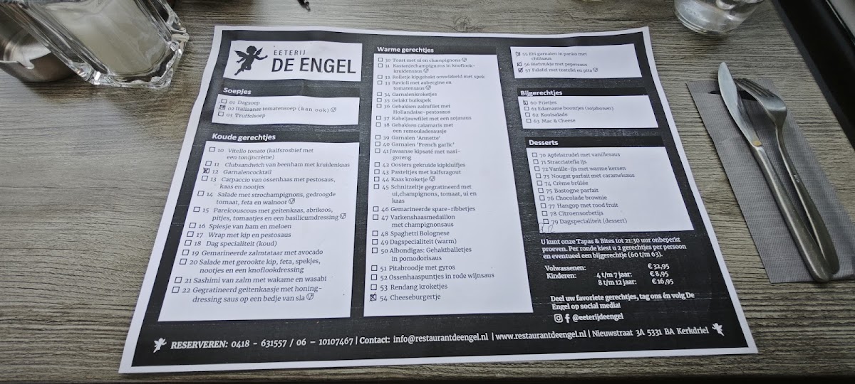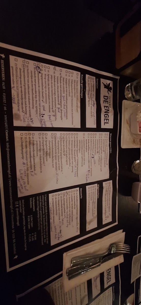 Restaurant De Engel offers a delightful dining experience with a carefully curated menu that highlights both classic and inventive dishes. A standout option is the Carpaccio, a beautifully prepared starter that captures the essence of freshness and flavor. The Zalm Tartaar En Ossenhaas Puntjes is another must-try, combining the delicate richness of salmon tartare with tender beef tenderloin bites, creating a perfect balance of textures and tastes. For dessert, the Kwarktaart En Hangop offers a refreshing and creamy finish to the meal, showcasing the restaurant's talent for balancing sweetness and tanginess. Each dish is thoughtfully crafted, showcasing the quality ingredients and culinary expertise that Restaurant De Engel is known for, making it a memorable dining experience.